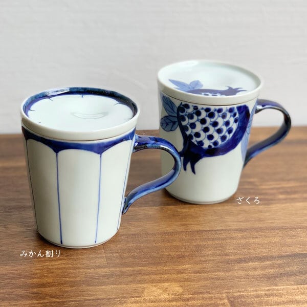 手描きの染付でおしゃれな蓋付マグカップです。 蓋は小皿にもなりますし、くぼみがありますので、 スプーンを置くこともできます。 約直径8.2×H10.2cm ・電子レンジ 〇 ・食洗機 〇