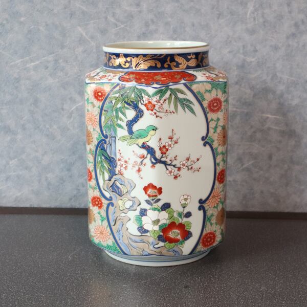 【送料無料】有田焼 8寸六角型花瓶 梅小鳥(木箱付) 18-037