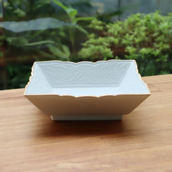 鳳凰の彫がさりげなく、おしゃれな色違いの角鉢です。
