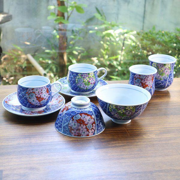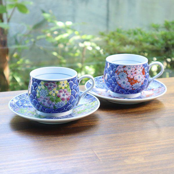 有田焼 コーヒー碗皿 青海波花絵 腰丸(緑・赤) 3-043