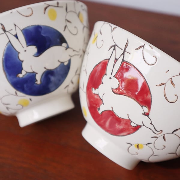 波佐見焼 丸茶付 うさぎ唐草(青・赤)9-173